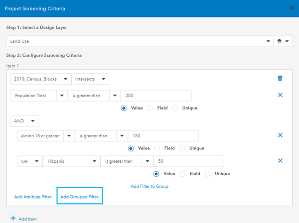 You can connect multiple attribute filters together in an item using a spatial operator such as AND or OR. For example, you may want to find the intersection of a design layer and census tracts where the population of the intersecting census tracts are greater than 200 and where the population over the age of 18 is greater than 150.